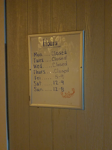 | Working: | Closed Closed Closed Closed 5–9PM 12–9PM 12–8PM |