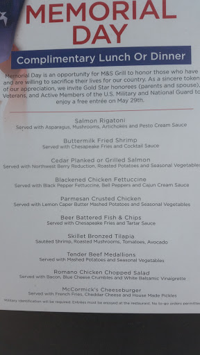 Went there for Mothers Day lunch today. NIce atmosphere, more open and inviting than the M&S restaurant (which I also love for more formal). The food was excellent - salmon, crab cakes, shrimp scampi all in nice portions. And the special truffles for Mothers Day, whammo! The restaurant was packed and there was a delay with food delivery, but our waiter and the manager were extremely nice. I did not have to complain, the manager came to our table on his own and made an appropriate concession for our wait. Im in the service industry and sometimes things go wrong. Its how a professional handles it. If the manager had not approached me and pretended it never happened I would have written a much different review about service (not food or decor). But he did come to me and handled it like a pro. Ill be back once I lose the weight from the truffles!