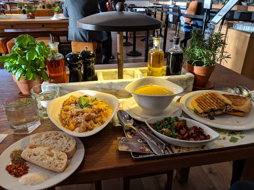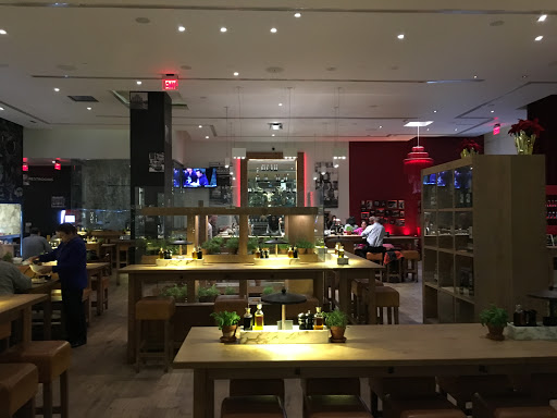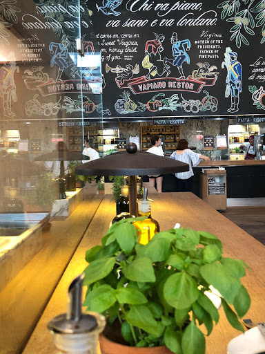 Really bizarre place. First the plus points: the location and the ambiance, sort of. The cons: 1) The concept doesnt make sense. If i want to have a salad, a soup and an entree; my choices are either to get them all at the same time, and watch my entree and soup get cold while i eat the salad, or get the salad, eat the salad, the go get the soup, have the soup, and then go get the entree. Its a stupid way of doing something which defeats the very purpose of going out to eat. 2) The food was overly salty. I ordered a wild mushroom pizza and a spinach ravioli which were both tasted by people other than me, and everyone came to the same conclusion. 3) There are people employed who stand at the entrance instructing everyone about this overly complicated and unnecessary process. Why not have waiters? Its not as if its going to increase the operational cost. Waiters barely get paid in the first place. What if want a refill halfway through my dinner? 4) No clear process flow here: as another reviewer mentioned, there are 4 lines for pasta, 1 for salads, another for pizza. Where to get the soup or dessert is anyones guess. There are drinks behind the counter where the food is being prepared, then a separate soft drink fountain sandwiched between the restrooms and the pasta making room, and finally a separate bar in the middle of the establishment. Its perplexing to say the least. 5) This is an intangible, but italian food is hearty food which is meant to be enjoyed by everyone together. How is that possible when everyone in one party is running around like headless chickens trying to get different kinds of food from different counters? 6) Finally, one can go to Carrabbas less than a mile from vapianos and eat the same amount of food, while choosing from a wider selection of menu items, while being served, for almost the same cost. Granted, youll have to tip, but since when is that a deciding factor in eating out?