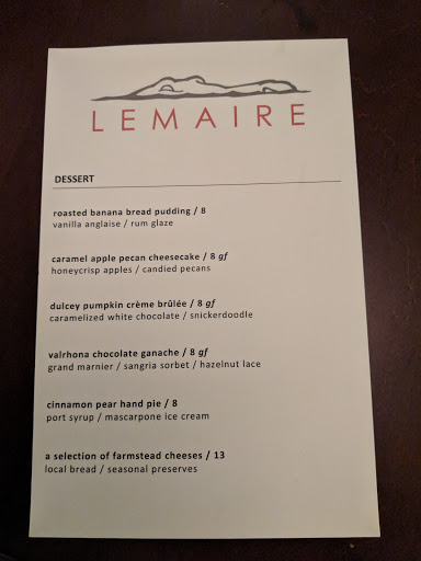 Can not recommend this place enough. I took my girlfriend here for our anniversary, and we were rewarded with an incredible dining experience. Our server was highly knowledgeable of the menu and ensured our night was literally perfect. From the drinks, to the appetizer, to entrees and dessert, everything was flawless. Expect one of the best meals of your life at Lemaire!