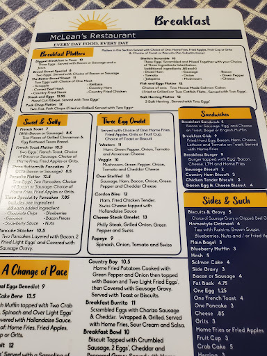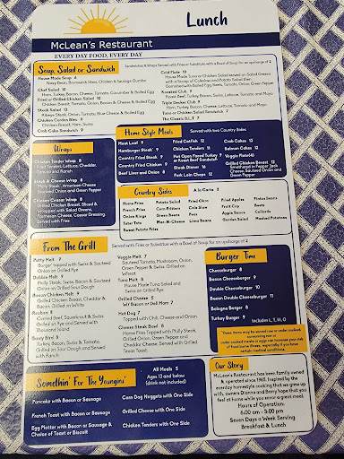 I have been visiting McLeans for over 20 years. I Love the SAMENESS of the whole experience.Great food and service and where else can you still get Fatback and Brains and Eggs or Roe??!! People have no clue what thats about sometime!! All i can say is "Three Cheers for the owners.. who have maintained price ,quality and service and offer us a Great Memory from the Past with each visit. Kind Regards,Suny
