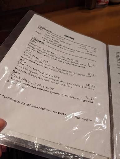Fav thai in rva -I usually get either masamun curry or the pad prik plah mouk. Highly recommend the vegan friendly mock duck :D Fyi medium spicy is pretty mildddd