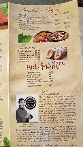 I met a old high school friend Wednesday evening, and we went to Timbers to catch up on old times. I have been there many of times, but this was my friends first time. Nadia gave us great service, and the bartender, Jamie made us my favorite mixed drink....... Liquid Marijuana. We started out with the crabdip, which was full of crabmeat and delicious. Then I had the ribeye and my friend had the chicken piccata. We each loved our food, the ribeye was cooked perfect, and she loved how lemony her piccata was and how tender the chicken was. For dessert, we spit the chocolate cake, and all we can say is Yum! The portions was great and filling and the prices was great, the ribeye was on Special on Wednesdays. Great staff and the owner Vito Amato even came out to say hi to me. Thanks you all for the great food, the great service and the friendly atmosphere. Me and my friend Debbie Parkin will be back