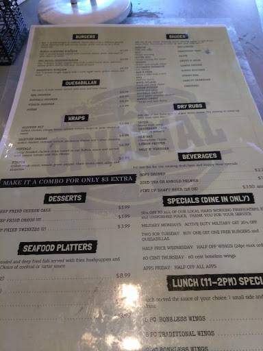 Go on Tuesday nights for half price burgers and quesadillas. Beer specials as well. Go for the suicide sauce, its the best if you like hot with good flavor.