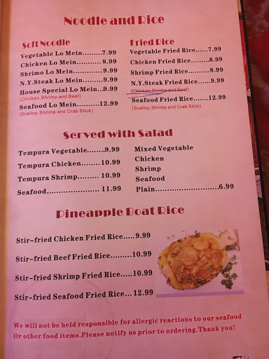 The waitress looked angry. The clear soup was disgusting. The crab Ragoon was good. The hibachi tasted old because yhe steak was mushy. I feel very bad I have to write this but we drove awhile just to try this place.