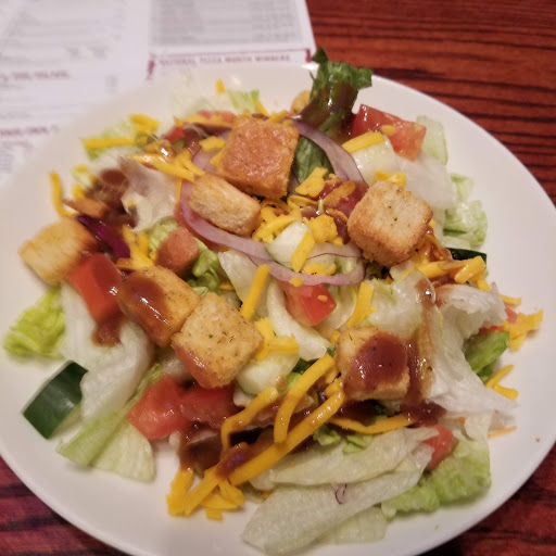 Fresh, tasty salad; loaded deep dish pizza, lots of cheese and meat with chunky tomato sauce; sweet server, whats not to love?
