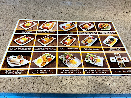 Ive been eating at Mobys for about a decade now and have ordered dozens of times. What I really like is the consistency of the food. It is always what I expect and remembered. I always get Moby Combo II because while I rarely order chicken when eating out, their chicken kabob is really impressive--juicy, flavorful, lean, and just plain appetizing. Their ground beef thing is fantastic too--again juicy, flavorful, lean, and so darn tasty. Their meats are complemented by their amazingly fresh and fluffy pita bread and buttery seasoned basmati rice. While the service is nothing to write home about and being that it is transactional in nature, I never feel that my feathers get ruffled here. Whenever I have kabobs elsewhere, the quality of the food is measured up to Mobys.