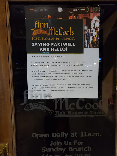 This is an Irish Pub in the popular Landstown Commons shopping center in Virginia Beach, just across Dam Neck Road from the Farmers Market. The restaurant is tucked into a corner of the shopping center, which means it usually is not too busy. I like it as an alternative to the much busier Buffalo Wild Wings as a place to watch the game. Finn McCools has some outdoor seating, which Ive never used. The service is good enough. The food is standard Irish fare, nothing special, but its pretty affordable. Overall, Ive been there several times and am sure I will be back. Never had a bad experience.