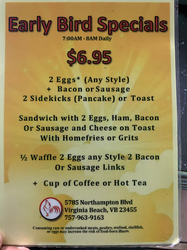 food was good but the meal was over priced for turkey bacon and eggs. I live in Newport News and most restaurant charge maybe a dollar or 2 more for turkey bacon and my breakfast was almost 9 dollars and it was not worth 9 dollars other than that the food was tasty. Please try to give a economical price for a regualar breakfast.