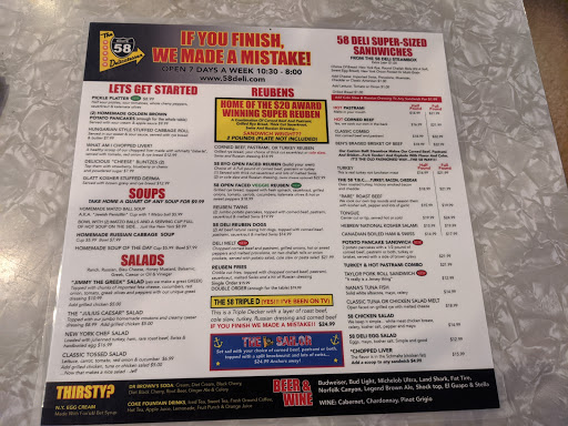 Smoke & mirrors and kitsch do not make a “DELI”. Unfortunatley, all of the true delicatessens in the area, Reisners, Uncle Louies, and The Kosher Deli over the years have disappeared, taking with them a lost form of traditionally prepared meats. What has risen in the dust and ashes is Route 58 Deli, which should have stayed out of sigh, not the Phoenix. What it perpetrates to be is not. Anticipating a mouth-watering Corned Beef & Swiss on rye, instead, I was presented with a flavorless, devoid of any taste, dry slices of corned beef round on toast and a cheese that was as equally flat & non-descript that was cold and un-melted. In the past, TRUE DELI‘s of Norfolk like Reisner’s, Uncle Louie’s and the Kosher Place cooked and served traditional, spicy, bursting with flavor Corned Beef Brisket. What I was served was a flat, flavorless devoid of any taste corned beef round. The cheese on my sandwich was an equally flavorless white cheese devoid of the traditional sharpness of Swiss. Additionally the cheese was of such poor quality is had not melted on the meat after having supposedly been grilled, which it had not. How do I know?, there were no grill marks on the meat. Smoke & Mirrors, watch out for the extra charges on the $14.95 base price sandwich. They added on .99 for Swiss and .99 for grilling. My recommendation. If you are expecting a REAL Corned Beef & Swiss, do not come here. Stop by one of the top Grocery Stores; buy your meats and cheeses. Go home and make yourself a great sandwich. If it doesn’t matter to you then come to the Deli 58. Do not be wowed by the picture of a 3” of meat stacked between the bread.
