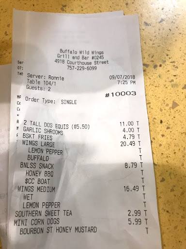 My wife and I stopped at BWW while we were in Williamsburg for our honeymoon. Earlier we saw a movie across the street then walked around the area, through Barnes and Noble and a few of the other stores. As fans of our local BWW back home, we decided to stop in here to get wings to go to take back to our hotel. The wings were pretty good, what you would expect from Buffalo Wild Wings, however, it took forty-five minutes from placing our order to get our food. I would strongly recommend placing your order very early before going to get your food.