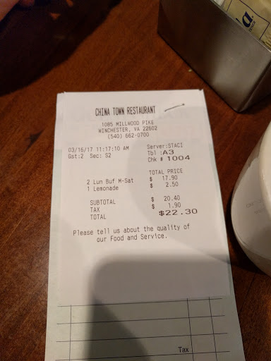 PERFECT!!! Stop reading reviews and go to this restaurant. You will not be disappointed: In fact, you you may remember this Chinese food as among the BEST that you have ever had. I travel all over this country and am on a personal mission to find the absolute best Chinese Food Restaurants while on my down time. Chinatown in Winchester, VA is in the top three and rivals my number one choice (Autumn Moon - Flagstaff, AZ.) The atmosphere, decor, cleanliness, service ware and especially the staff & cuisine were top notch. In my opinion, great Chinese food is all about the sauces and Chinatown served wonderful sauces. I had the Combination (Special) Lo Mein. Ayla was my server and she was terrific! The owner has obviously taken the usually expected and non-descript Chinese food restaurant to the next level and beyond. Again, stop reading and Go Now!