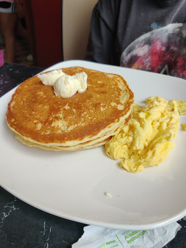 Food is good, above par for the all day breakfast restaurant club. I wish the staff didnt drag this place down though. I have been here twice in the last month, and both times the wait staff was shouting at each other over booths. Last time we went we got sat at an uncleaned table. Hostess just stood there holding the menus while I swept the food crumbs and straw wrappers onto the floor. No offer to get the table cleaned. My meal had a bowl of strawberries with it, in the bottom of the bowl was a takeout receipt. Seems like checking the dishes before you put food in them is pretty basic. Not sure what the miss was here. This place would be great if front staff would step up a bit.