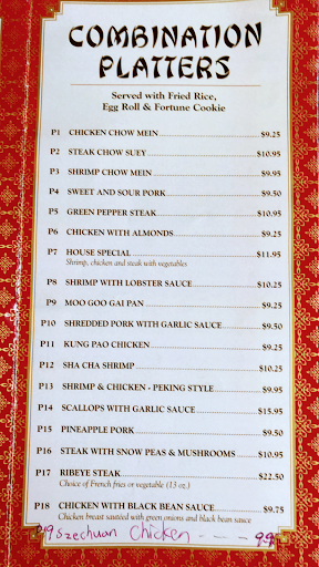 Tl:dr - Save your money and go elsewhere. I am unsure if everyone here ate at the same place I did, but this restaurant was fair at best. To begin, all I have heard from locals is how great this place is and how they go here on dates and so on and so forth. The bar was set pretty high. I ordered the General Tsos Chicken...a staple of any Chinese restaurant. They did not have a combination platter of this so I paid extra for fried rice and an egg roll. I was also asked what kind of heat level I wanted my food.... from mild to hot. I ordered hot, because I like my food spicy. The egg roll came out first. This is the first time Ive had it served as an appetizer, but I was hungry and it turned out to be delicious. So far, so good! Then...the main meal arrived. I was very excited and prepared for a delicious meal! An empty plate was placed in front of me, then a platter placed beside that. A platter full of ... vegetables?? Thinking I was given the wrong meal, I questioned the waitress, (whom was very polite and a very good waitress btw) but she confirmed that it was, indeed, what I ordered. Imagine my disappointment when I spooned a bunch of veggies and a few pieces of chicken onto my plate. It looked like something you would buy at a grocery store from the freezer section and reheat at home. Surely the taste would make up for appearance and lack of chicken, right? Wrong! It tasted exactly how it looked. It was the sweetest sauce Ive ever had on General Tsos, and even though I ordered hot, there was not even a tiny bit of heat! (The fried rice was completely tasteless as well.) So, I slogged through eating it and begrudgingly paid the $11.40 bill for something I could have made at home for a quarter of the price. Save your money... go elsewhere!