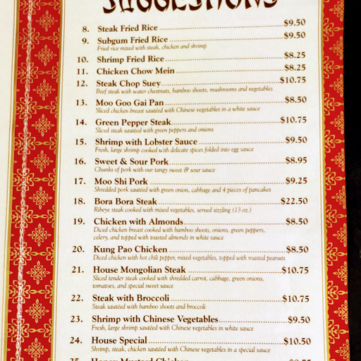 THE DECOR IS LOVELY AND FITS WITH THE TYPE OF FOOD SERVED WHICH IS CHINESE CUISINE. THEY HAVE AN ALL YOU CAN EAT LUNCH BUFFET EVERY SUNDAY WHICH FEATURES A WONDERFUL SELECTION OF THEIR BEST DISHES INCLUDING SEAFOOD. THEY HAVE TABLE SERVICE WITH FRIENDLY AND KNOWLEDGEABLE STAFF AND THE OWNERS ARE ALWAYS PRESENT TO GREET YOU AS YOU ARRIVE AND THANK YOU AS YOU LEAVE ALWAYS ASKING IF YOUR DINING EXPERIENCE WAS ENJOYABLE. THEY DO SERVE A NICE SELECTION OF ALCOHOLIC BEVERAGES INCLUDING BEER BOTH AMERICAN AND ASIAN, PLUM WINE, SAKI AND A VARIETY OF MIXED DRINKS. THEY ALSO OF COURSE SERVE BOTH COLD AND HOT TEAS. I HAVE EATEN IN CHINESE RESTAURANTS FROM THE EAST COAST TO THE WEST, FROM THE NORTHERN STATES TO FLORIDA AND HAVE YET TO FIND ONE THAT SERVES BETTER FOOD. FROM THEIR APPETIZERS AND SOUPS TO THEIR ENTREES THEY ARE ABSOLUTELY THE BEST IVE HAD. IF YOURE EVER NEAR WYTHEVILLE, VIRGINIA ITS WELL WORTH THE TIME. TRY IT AND YOULL AGREE...