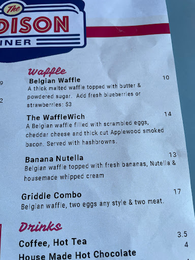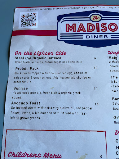 Both myself and my wife were very disappointed in the quality of the food and the serving. I would go so far as to say it was the worst food Ive ever experienced. In our working days both of us were in sales in various industries and had the opportunity to experience food from all parts of the country. Plus weve made several trips to Europe and the UK, knowing not to expect to much with British food, I would have to say the British food was a great deal better than what we experienced at the Madison Diner.