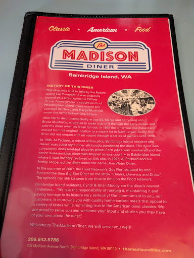 Madison Diner somehow works well on Bainbridge Island despite being a shiny lunchbox on an island more accustomed to a hemp sack. Why? Because everyone likes a greasy spoon. They are reliable and almost always good. They are a slice of apple pie, or maybe even home cooking. Amongst the organic and cage-free granola crowd, a greasy spoon is exactly what tourists and locals secretly crave. The staff is young and friendly. The food is good and fast. And the atmosphere is fun! Only complaint is that business hours are not always kept. If service is slow, they will close up early. So reliability in that sense is, well, not always reliable.