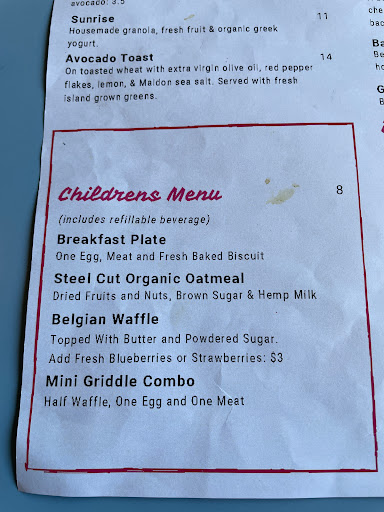 My wife and I like to eat dinner here periodically. The food is reasonably priced which can be a problem eating at some restraunts on Bainbridge. The waitstaff is comprised of local teens, which can have mixed results for service. That being said its, if you need a refill or anything just ask; the dinner is fairly small and your waitress is close by. I almost always get the chicken and waffles. My wife prefers the chicken club with avacados. Weve never had any problems with our food. They do make some pretty good burgers too. I always enjoy the biscuits; theyre fresh made daily and the closest I can get to a home style, southern biscuit I can get as a southern transplant. There is always a board with interesting, seasonal specials. If youre on the island its a nice place to eat and use the free WiFi.