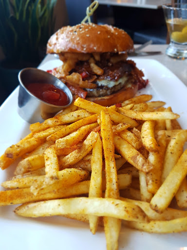 Very good quality food. Nice atmosphere. TV for sports and a fireplace outside at the outdoor seating area. Plenty of parking, easy to find because of the Hotel.