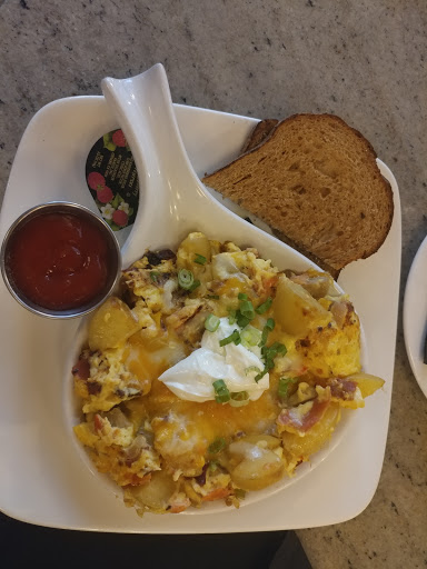 On a Sunday morning the kitchen was backed up. It took 10 minutes after being seated just to be given a menu. They were understaffed (only one server). This would have been tolerable if he had explained the situation. I wasnt in a rush and Im fairly patient. One thing that was not tolerable was the inattentiveness. My breakfast comes with toast, a choice of white, wheat, etc. He never actually asked what bread I wanted. Long after my meal came, he said my toast was on the way. Id forgotten I was even supposed to get toast. Then as an afterthought, he said "you dont mind if there is butter on it do you?" Well, if hed bothered to asked in the first place, hed have known that I prefer sourdough dry, not wheat buttered. But to facilitate things, I said "just bring it how its being prepared." I polished off the rest of my meal and finished my coffee. When he came back and was about to clear the table, I said "I cant remember....does my meal come with toast?" "Oh! It never came out?" He disappeared and eventually returned with the toast. Then he cleared everything on the table, including the butter knife. Im not prone to spreading jam on my toast with my fingers, so I had to wait for him to return yet again so I could get another knife. The only thing that saves this experience from a 1-star review is that the Chefs Skillet is actually pretty tasty.
