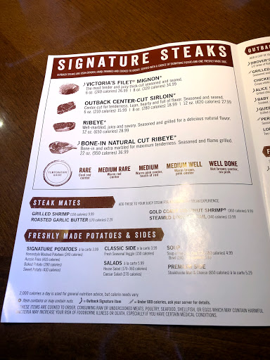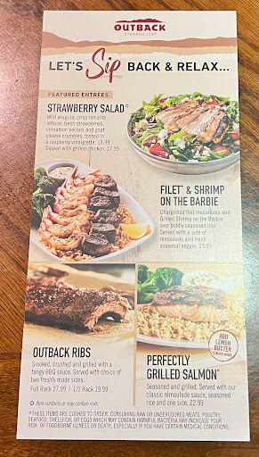 Nice waiter... too bad nice doesnt taste good. We had a party with reservations, so they knew how many and what time. 1 waiter for a table of 13. There was a 15 minute gap between the delivery of our dinner orders! Thats a first for me. The prime rib was right out of the refrigerator. Weirdly cold. Tasteless filet mignon if really a filet. Blooming onion? You mean batter with a splash of onion? Management problem no doubt! Thanks Outback for a slow, cold, yukky birthday! Wish we had good memories of this birthday party that only happens once in a lifetime. Get it together!!!! I gave one star because I had to.