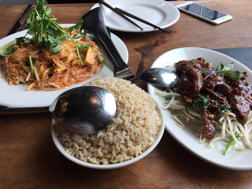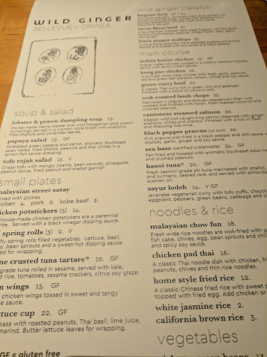 Wild Ginger does not have as tasty of Thai/Chinese food as you could get from a more authentic restaurant, but it elevates the food with a downtown Bellevue ambience and service that you wouldnt get at a more authentic place. No paper napkins and wooden chopsticks here! Sub a location next to Jimmy Choo with validated parking and dim mood lighting. The prices are inflated to match, so a decision has to be made -- do you want better food or ambiance? (Though, Bai Tong has both for Thai food.) We had the: Pad Thai -- Very subtle sweet flavor. Definitely not "ketchupy" like some American Pad Thai can be, but almost too subtle in flavor. Sichuan Green Beans -- like gan bian si ji dou. Delicious. Great bite to the beans still left. Green Curry Chicken -- Chicken was tender and flavorful. Seven Flavor Beef -- when I saw how drenched in sauce this beef was, it did make me think of a fancier orange chicken. Very sweet, but a guilty pleasure. Mango Sorbet -- now, this was good! Mango with twists of lime on top. Ive had better food elsewhere, but I think Wild Ginger is good for a fancier dinner if youre craving Asian food