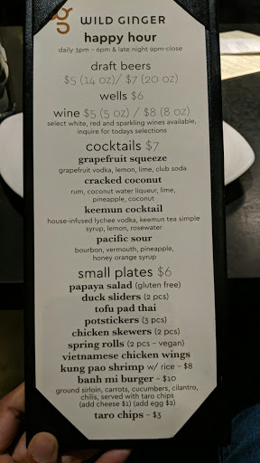 New Location; AVOID, Hair in Food/No Happy Hour After years of going to the Seattle and Bellevue Wild Ginger, decided to try the new place. First off, there was no longer a happy hour menu for food! Secondly, no more duck sliders(their specialty) and no more Buddha Rolls. Menu was much different. Ordered Phad Thai, which was OK, but half way through eating discovered hair in the food! Got a substitute dish, which also wasnt good. In other words, dont bother with the new location, its gone downhill. Avoided 1 star because the service was friendly/good.