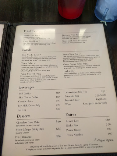 Ive eaten at a lot of Thai places and also know how it should taste from a culinary aspect. I was severely disappointed. The phad thai was waaaay too peanuty (should be a hint of peanut, not coated in it). The "fried" rice was not fried but clearly seasoned sticky rice. They also didnt serve cream cheese won tons which are a classic thai staple. For one star the food was much too spicy as well. The only redeeming quality was the plate presentation, lovely. But we wont be going back.