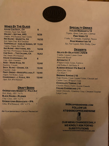 I recently found my way to 909 Coffee and Wine in Burien after my wifes yoga class down the street. The menu looked promising, but I am frequently disappointed by restaurants. I have worked in the restaurant industry for over a decade at some extremely high quality dinner houses and am disappointed with poor or sloppy execution and low quality ingredients. I have to say I was thoroughly impressed by 909 Coffee and Wine. The food was very well executed, surprising reasonable in price and really hit the spot. Perhaps I thought the food would be sub par because it was in Burien or perhaps I expected it to be more coffee shop/wine bar than restaurant; however from the bread served to salads and main courses everything was very well prepared and used high quality ingredients. My braised lamb shank was quite large, but meltingly tender with a very flavorful bed of french green lentils, and my wifes crab stuffed crepes with creamy tomato sauce were great, too. I only wish we had stayed to have dessert also!