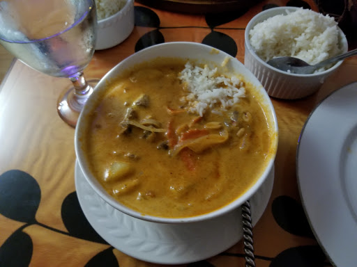 Down in Des Moines, in one of those "location might suck" kind of corners (everyone coming into the town can see the place, but figuring out how to get there, around triangles, traffic islands and even a roundabout, can be tricky) is an inconspicuous little place called the Thai Bistro. From this unassuming name with an unassuming front, youd assume it was one of those gazillion or so Thai restaurants that dot the Puget Sound landscape. Youd be half-right. Inside, you quickly come into something different: a home that has been converted into a restaurant, but with the architecture intact. It feels nothing like a restaurant. Then the other details hit you: every table has a unique and beautiful tablecloth, and where there arent 19th century wooden dining chairs, the ordinary black four-footed chairs that would have served you in any diner have been clothed in hand-sewn silk covers that not only hide their ordinariness but give the place a bright, cheerful sheen that will make you smile. Each placing is equally carefully chosen and assembled with exquisite care, ending with a seven-inch decorative... thing... of wrought iron that holds it all down while looking like a cross between godzillas letter opener and the Kaisers war helmet. My wife ordered the Ocean Surprise, with a Mango Lhassi that she later said was completely up to her standards. I ordered something called the Basket of the Sea. (Des Moines is an old fishing boat harbor, now turned over to wealthy people with enough money to buy yachts, but not enough intelligence to live with them sanely.) The Ocean Surprise consisted of scallops, shrimp, wontons, leechee, avocado and mango in a green curry that was utterly delicious. Everything was cooked perfectly. The Basket of the Sea was a surprise: on oven-baked husk of aluminum foil, inside of which I found mussels, shrimp, scallops, squid, with basil leaves and spinach in a red curry paste so thick it was almost grainy, and so soft it melted to satin when it touched my tongue. With a side of jasmine rice, both meals were delightful. I havent had red curry like that before, and I will definitely have it again. There is a family altar along one wall, typical in Thai restaurants, and the kitschiness of it (plastic pumpkins from the recently passed Halloween flickered with LEDs next to hand-blown glass vases with flowers) made the rest of the place seem elegant and delightful. The food was fabulous and the ambience extraordinary. It was a momentary transport to another world, and I recommend it.
