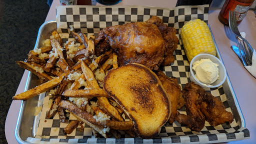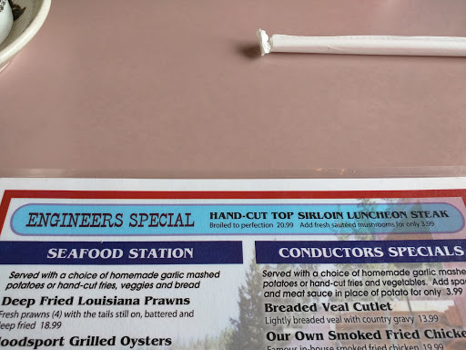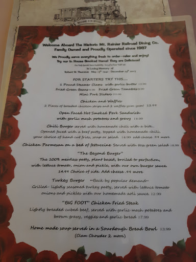 Stopped here for dinner on a day trip with my wife to Mt. Rainier. I had the fish and chips and my wife had the smoked fried chicken. Both dishes were huge! For the price you pay you get a lot of food. It was more than we could finish. Which is a good thing! This food is delicious and you will want to take it home! The restaurant is very cute and reminds me of an old diner. Seating is plentiful and the service is great. I really like the ambiance of this place; Makes you feel at home. The rest rooms were very clean and stocked. They also had a small gift shop in the entry way which was nice. All in all I we had fun and will come back again. Thank you Railroad Dining Team for a great experience :D