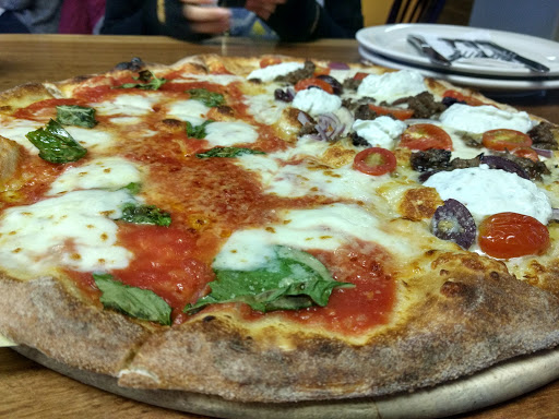 Nine of us sat at a nice long table, drank good beer and wine, split 4 awesome pizzas, and even had some wonderful gelatto for dessert. Restaurant was nice and quiet, made it easy to talk around the table. Food was great, and the Blueberry Goat Cheese pizza was a hit. The staff was all smiles, as were all the diners. What a great little pizza place, we will definitely return soon, so many more interesting pizzas to try!