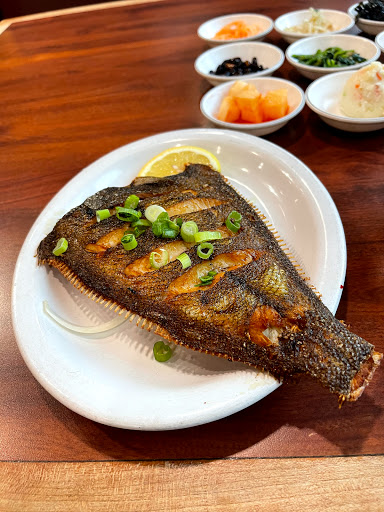 The meal started with 12 (yes 12!) delicious side dishes made fresh every hour or two—most places offer 6 or so bland & mediocre side dishes. Then our entrees came out and I was surprised at the portions. Fish was large and fried wonderfully. My stir fry spicy squid was flavorful and had the right texture. Had a beer on the side. Wonderful meal and service, what else can I say?