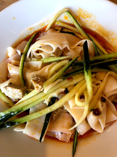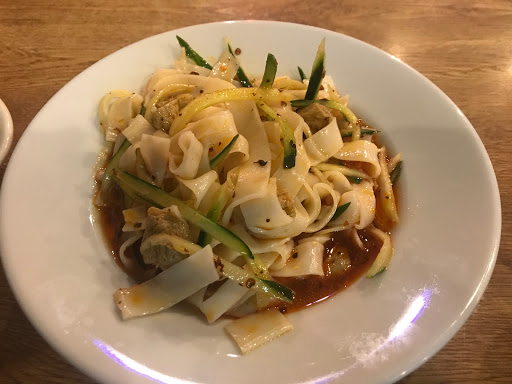 The seared chili oil biang biang noodles are the thing I crave most, with hand pulled and seared noodles and bok choy. Theyre not overly spicy, so I usually add some chili paste. The cold rice noodles are served with torn flatbread pieces, cucumber, and the most addictive sauce--which I pour onto everything, and in which I dip the sesame oil broccoli.