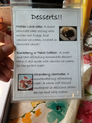 Very good food and service. Wonderful desserts. Nice country relaxed atmosphere. Like playing trivia at the table. Really enjoy the historical photos, etc. I have to get there for breakfast sometime, hear it is outstanding.
