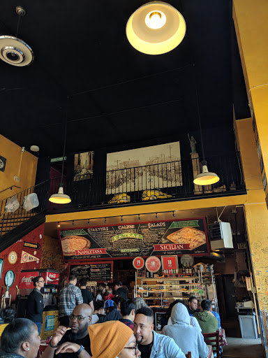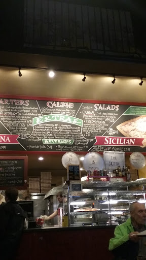 I keep coming back here. For one, the pizza is excellent. I am not from New York so I cant very well compare but it is exactly as I imagine a New York pie to be. The quality is top notch and the other menu options are great. It is the only place in the area I can find a decent cannoli. The staff enjoy their jobs and it rubs off into the customer experience. I almost took a star away for the seating and placement of the drinks because it is hard to find a seat and the fountain drink line bumps up against the pizza ordering line. But... I can hardly fault this to the company as their pizza and business is simply very popular.