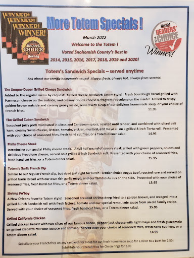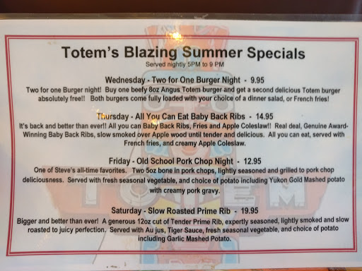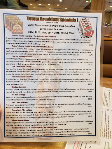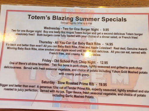 I have been going to Totem for a few years now. I have to say that before the original owners sold the restaurant, the size portions were huge so I did not mind paying so much for what I got. The food was great and never over cooked. And the service was really good and friendly. Since the "New Owners" have taken over, I have only been there 3 times. The first time, I ordered the Farmers Mix and noticed how the size portion was about half what is was before but the price stayed the same. Not to mention there was what I believed to be extreamly burnt onion or green peppers in my food. So burnt, that I am not sure what it was exactly. I complained and Totem paid the bill. The next time I came in, again the size portion was half what is was previous to the sale of the restaurant and the price the same. I see no reason to pay the same price and get only half the portion. The service was less than friendly and almost non existant. The waitress was more interested in staying in the kitchen area talking with co-workers than they were in waiting on the customers. Needless to say, she did not earn a tip that day. The third time, I ordered something different, but still have an issue with the price vs portion size. I know the new owners have bills to pay, BUT if your going to cut your size portions in half, at least lower the price some so we dont feel like we are paying your bills for you. The potatoe chuncks were so large that they were seriously undercooked. The service by my waitress was again non existant and again, she did not earn a tip. I also noticed that the restaurant seriously needs to professional cleaning. There is a layer of dust about an inch think on every picture hanging on the wall. I dont think this place has had a good cleaning since it opened.