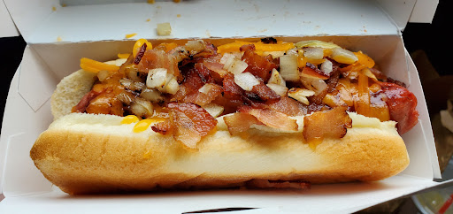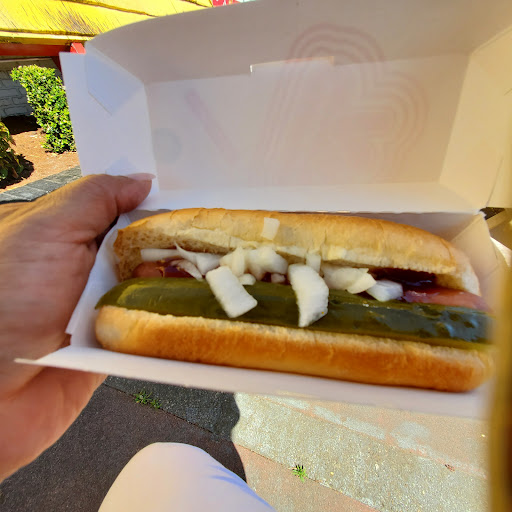 Just a weird fun place to go for a hot dog anyway you like it. Also has burgers fries soft drinks and deserts. Drive through and bathrooms are available. Courteous clerks and fast service!