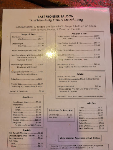 Every time I have been at the Last Frontier Tavern I get quick service even if it is packed like sardines the bartenders always make sure I have a drink for me and my guest. Even if the guest is not drinking an alcoholic beverage they are still on the job serving drinks and customer service. Even as busy as they are they carry 5 to 100 conversations at the time keeping up with everything said as they go. You cannot beat the hospitality