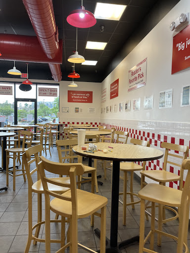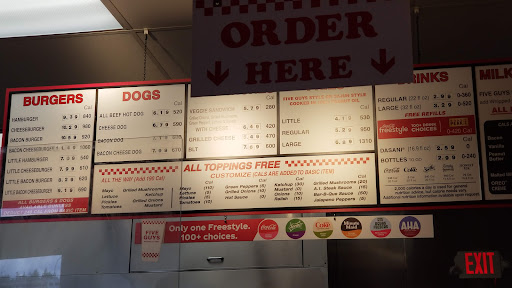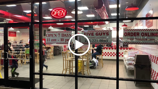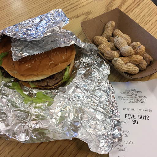 ALWAYS love Five Guys Burger. THIS location is great, the staff is AWESOME with great friendly service. Love the FREE peanuts. Also, a side note, the music sound track is fabulous. Great classic rock music. They are not cheap, it is usually $25 for 2 adults, but from time to time. It is always high quality food, fresh and delicious