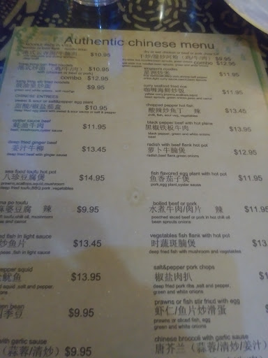 I frequently purchase food for take-away. The Sweet-and-Sour pork/chicken is standard American Chinese fare. They use a bready coating (rather than a crisper coating). The Crispy Duck is quite good. The Pork Fried Rice is excellent, though Im somewhat at a loss to explain why I find it so. I have tried a few other menu items, including Mandarin Chicken, General Tsos Chicken, and Walnut Shrimp. The first was bland, with limp vegetables. The second is passable, but not deeply flavored. The third is somewhat cloying in its sweetness, but I do enjoy it.