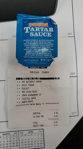 I enjoyed the meal I received, first time going to Popeyes. The service here was good, I went inside to see the menu better, and the employees I interacted with were very nice, Aja was the girl at the register, who was helpful and patient. I enjoyed the macaroni and cheese side that I got with the dinner meal (I opted for dinner over combo since the drinks are a little pricey), but Im interested in going back and trying more side options, there are a lot of delicious looking sides.