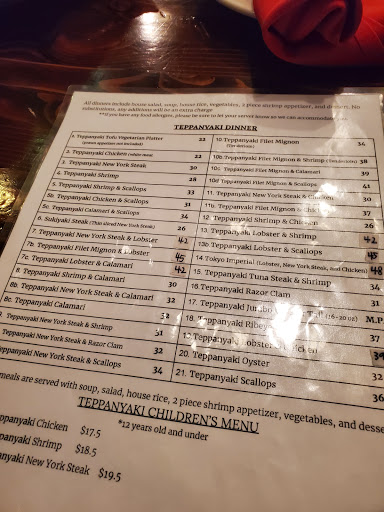 Weve been to Tokyo probably more than 10 times so its time for a review! Every time we have come here we always have a fantastic experience. The food is delicious as is their orange sauce. The chefs will cook your meal differently if you have dietary restrictions I.e. no butter, salt, soy sauce etc. I find they are more than open to learning what you want and doing it. The chefs presentation is great. Weve had different types of chefs and their personality and jokes are never the same. The chefs make jokes, talk to the babies at the table and make everyone feel comfortable. The food is large portions and you can get sushi. They also have a full bar. Ive come with partys of 2 all the way to partys of 15 and have always received the same high level of service. I will come back and recommend someone to eat here in a heartbeat.