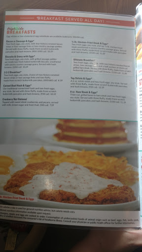 Great place to eat. Nice and peaceful. Three of us got some good food. Ultimate breakfast, Combo (choose your own food), and bacon and eggs plus 2 coffee (ahhh just right) cost $41.38. At Dennys $60.00 dollars but the food at Dennys yuck.