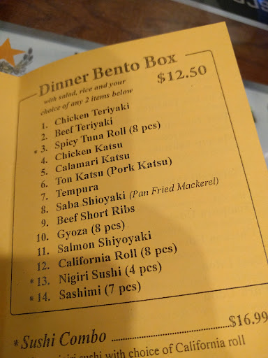 Absolutely out of this world! Great sushi, fresh fish and excellent prices. They also have a hefty list of special and unique rolls if that is ur pleasure. One of the BEST things are the Bento boxes, for 12.50 at dinner u get a choice of 2 items on the list, and a small sashimi platter (7 PCs) are one of the item options along with hot dishes like teriyaki chicken and beef, ton katsu, as well as calamari and chicken katsu! U can NOT go wrong with the Bento boxes. Reasonable prices and crazy great awesome device. The entire staff is friendly, helpful and kind hearted. They went the extra mile for me and it has made us return 3x this week!! All things aside, the food is simply put, outstanding. Very fresh fish cut to perfection by someone who clearly knows what they are doing and has the proper knives to do the job. Even the miso soup is a step above, with little eonoki mushrooms floating by happily and enriching the flavor immensely... Dont hesitate!! Just eat here u wont regret it!!!!