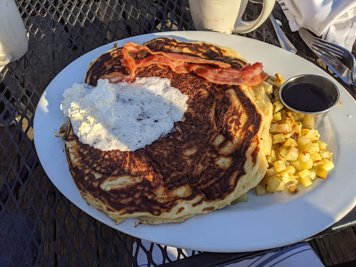 Netshed No. 9 has a nontraditional and creative breakfast menu, reasonable portions. ricotta pancakes, sourdough french toast, huevos rancheros, texas chili with egg on top. Busy and hard to see from the road, but Good stuff!
