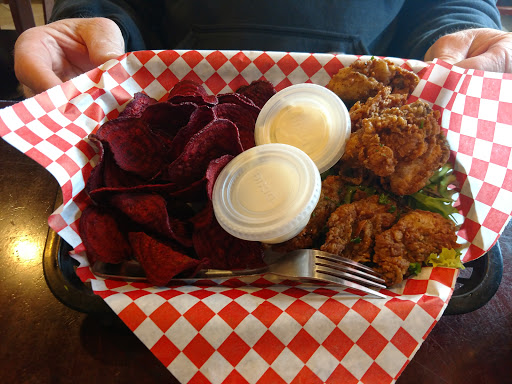 Go ahead and head downtown rather than stay by the highway. There are several parking spots behind the building. Plenty of parking just across the street by the park. We had three different burgers, each about six inches tall next to a heaping pile potato strings, onion rings or fried beet chips. I enjoyed the avocado burger with onion rings. This is one of these best burgers I have had in a long time.