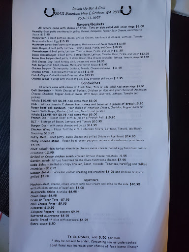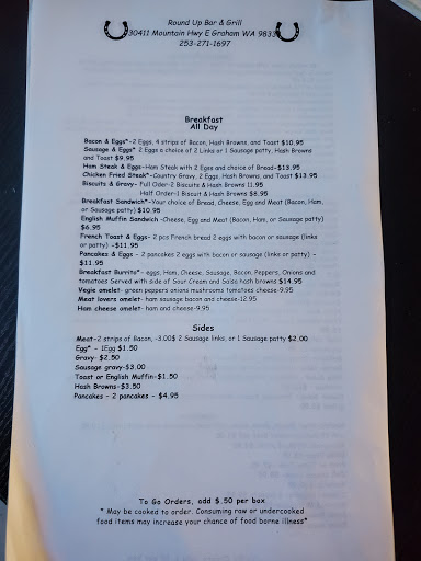 Just moved to WA from NV and needed a new breakfast joint. Tried several of the restaurants that were recommended by locals and havent found a place even remotely good. This weekend we were taking some back-roads from Graham to Lacey and decided to stop at the Round Up Bar & Grill. I can not say enough about the service or the food. Excellent, excellent food and sassy/friendly service. You are the new breakfast place is our lives. See you again soon!!!