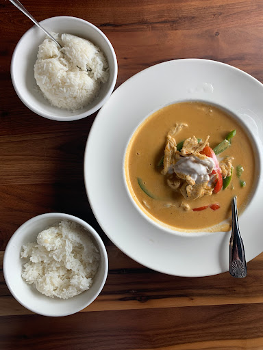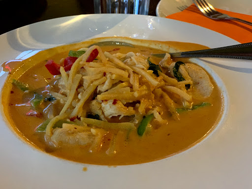 I ordered the crab puffs, Panang chicken curry, wonton soup, and chicken fried rice. The curry sauce was tasty but had to be Spicer than I requested, because I asked for a 1 and got above a 2 (I normally order a 2 for lunch). The service was great to start, we were greetied and seated quickly we got water and ordered quickly, but after that no one checked on us. Then our food came out the server put the plate at the edge of the table and walked away, she didnt make eye contact or notice we needed more water. The place is nice, buy the food leaves much to be desired. So I will cross this place off on my lost of where to eat.