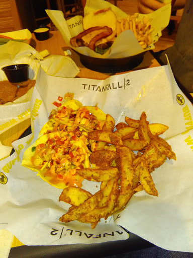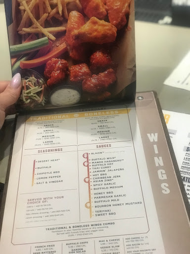 The food here is fantastic. Im pretty plain and I usually like the medium buffalo wings, but Ive recently tried a couple of other flavors and they were pretty good as well. The mango habanero wrecked my day, but that is the fault of my own weakness. In addition to just wings, Ive tried their BBQ turkey burger, mozzarella sticks, and fried pickles. I can absolutely say Ive not gotten food from BWW that wasnt good. But I prefer to get the food to go. Heres why: The online ordering is the best thing in the world. The web interface is super intuitive, and they have a separate door for take out orders. You dont even have to deal with the bustle of the front entrance at all. In addition to that, unlike most places, they check your entire order right in front of you before it goes out the door. That is, as opposed to having you drive all the way home only to realize you didnt get any ranch, or other nightmare-inducing tales. Their in-house service is a different story, though. Its hard to say whether we just got a mediocre waiter, or if they happened to be spread a bit too thin that day, or any other number of excuses. But there were these big, extended chunks of time between each time wed actually see the guy, he failed to bring us the correct sauces 3 out of 4 times, and we had empty water glasses sitting at the edge of the table for ~45 minutes until we managed to flag him down to get a refill. Its also a bit loud, but thats just a personal complaint. A lot of people like the high-energy atmosphere. But yes. Definitely will be having their food again, though it will be in my living room in a take-out box.